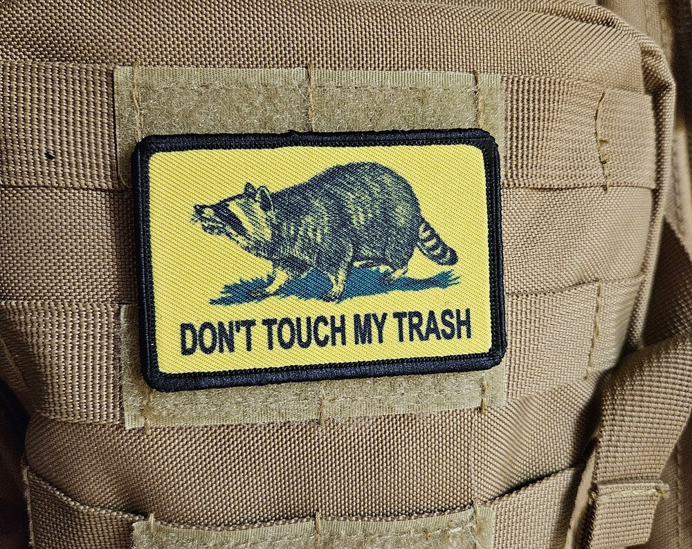 Don't touch my trash raccoon Gadsden flag meme 2"x3" removable morale patch with hook and loop backing