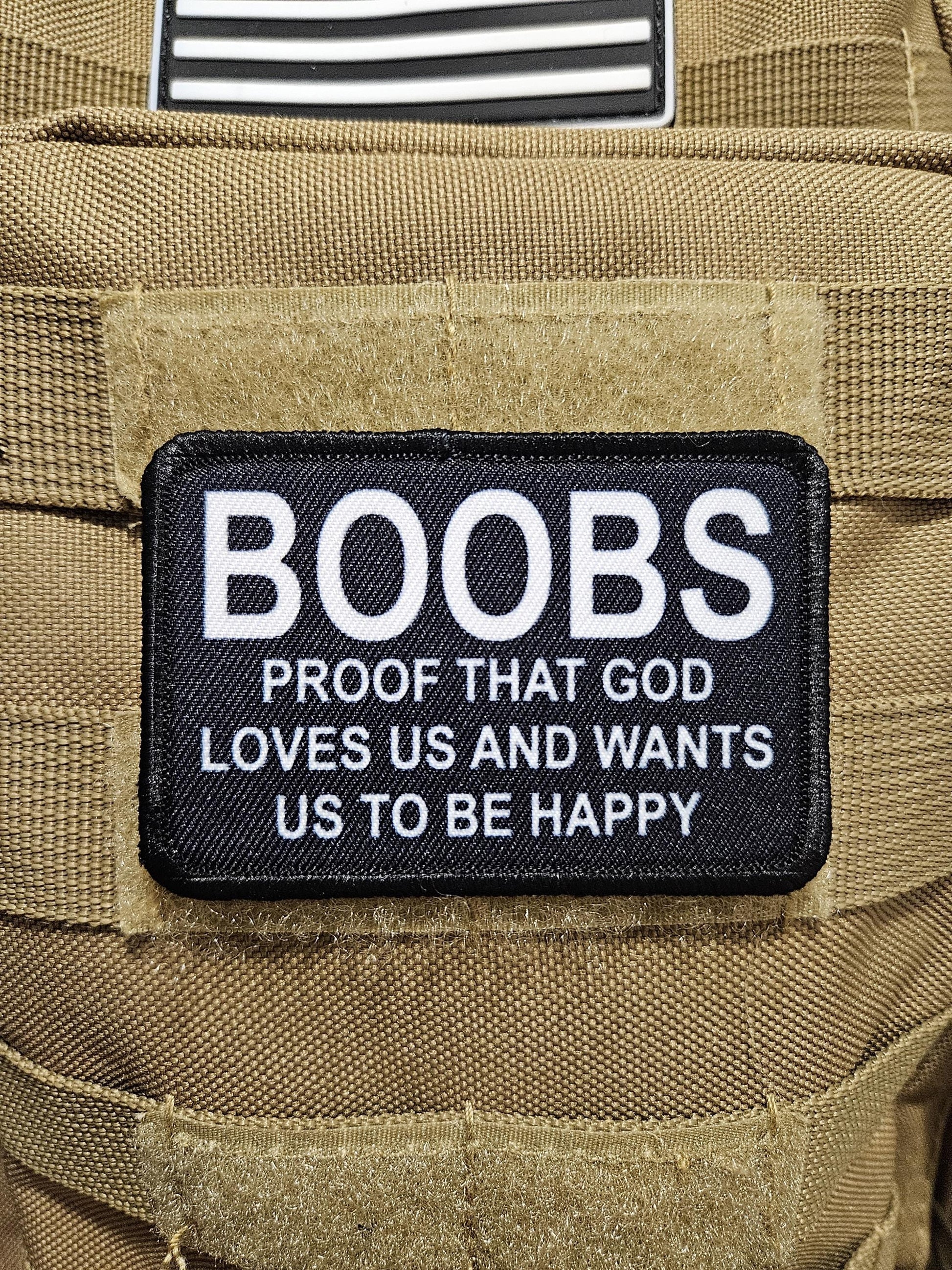 Boobs proof that God loves us and wants us to be happy meme 2"x3" removable morale patch with hook and loop backing black and white