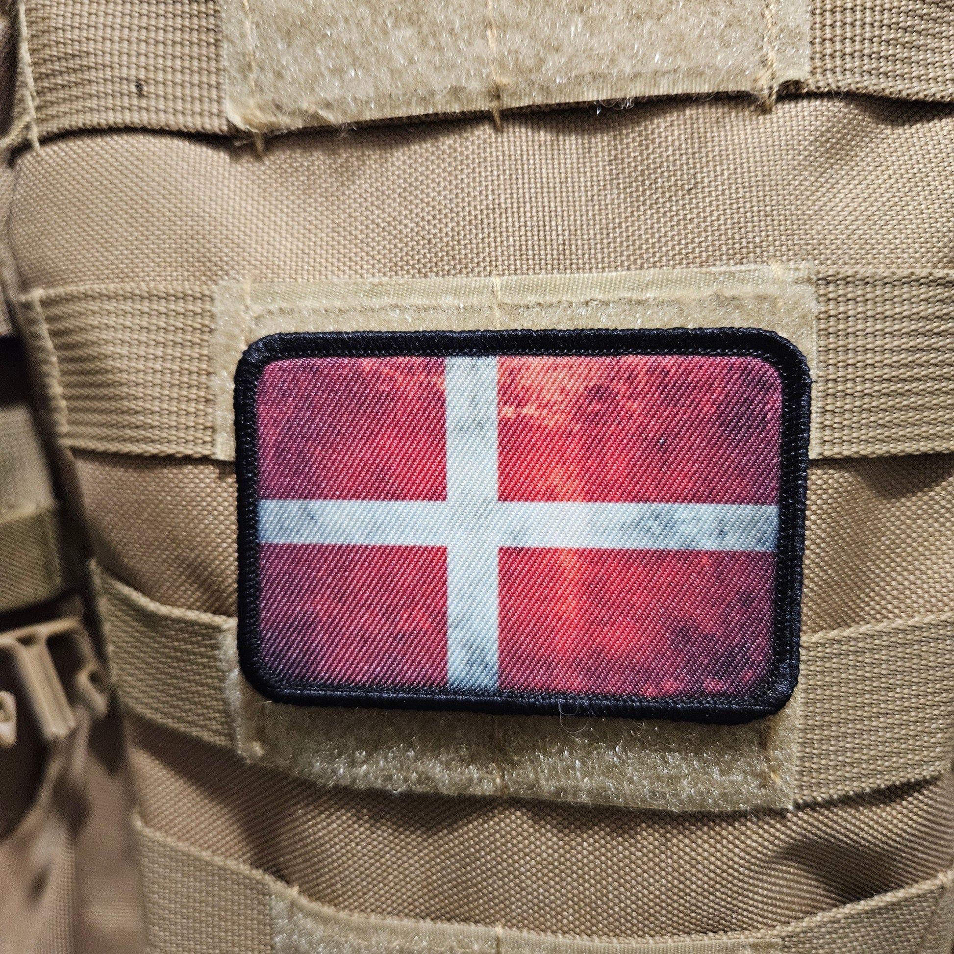 Distressed Denmark flag 2"x3" morale patch with hook and loop backing