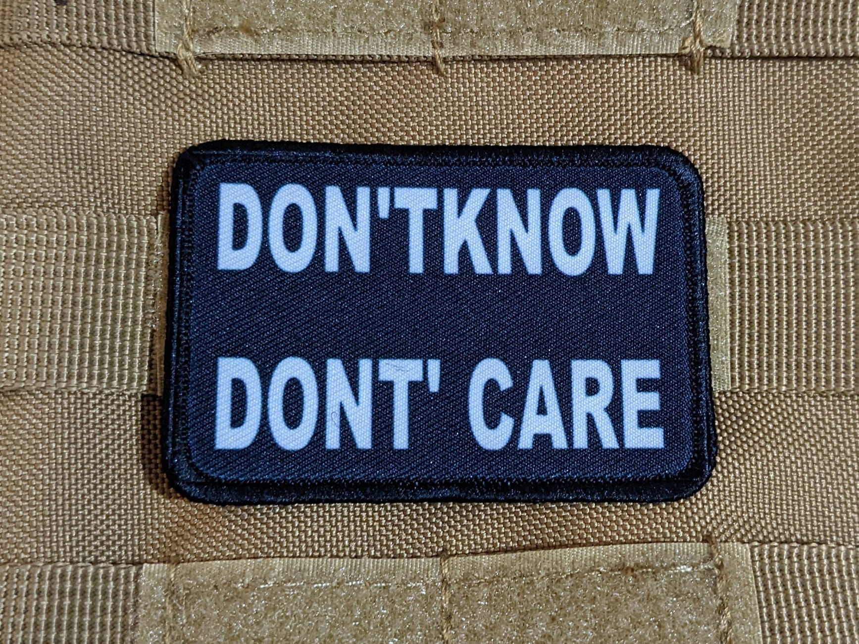 Don't Know Don't Care funny 2"x3" morale patch with hook and loop backing green background