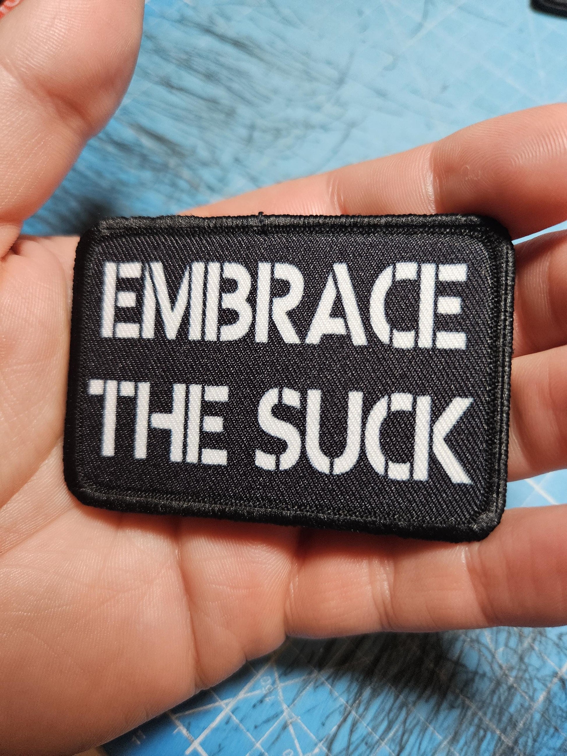 EMBRACE THE SUCK army military navy funny 2"x3" morale patch with hook and loop backing green background