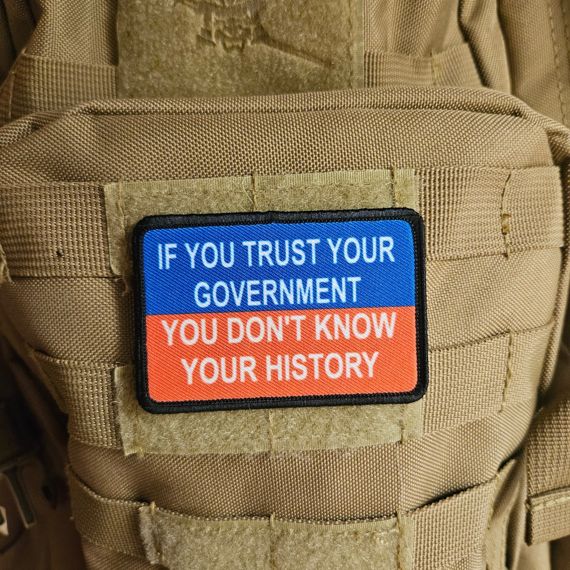 If you trust your government you dont know your history meme 2"x3" removable morale patch with hook and loop backing