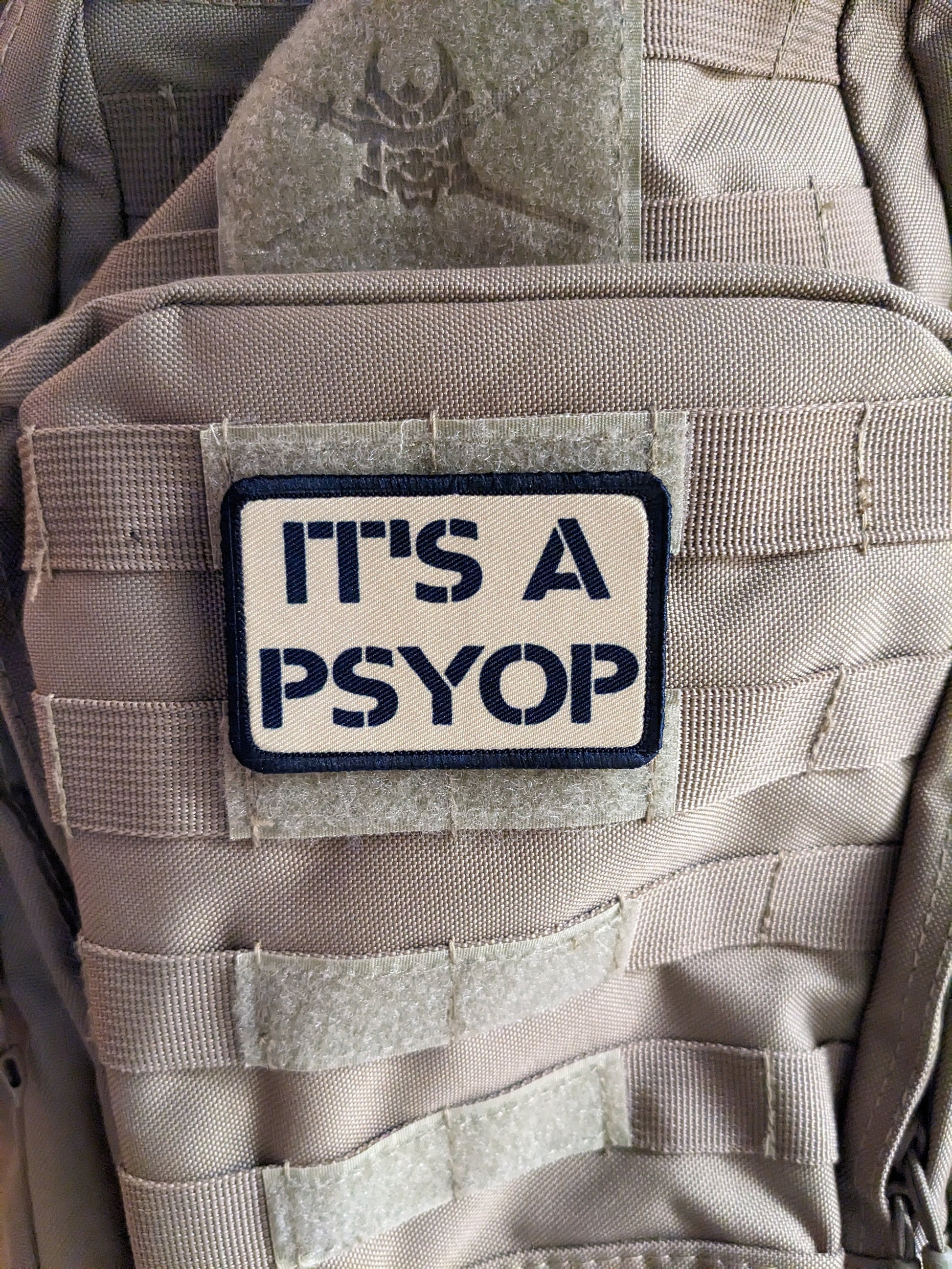 It's a Psyop conspiracy joke tan 2"x3" morale patch with hook and loop backing