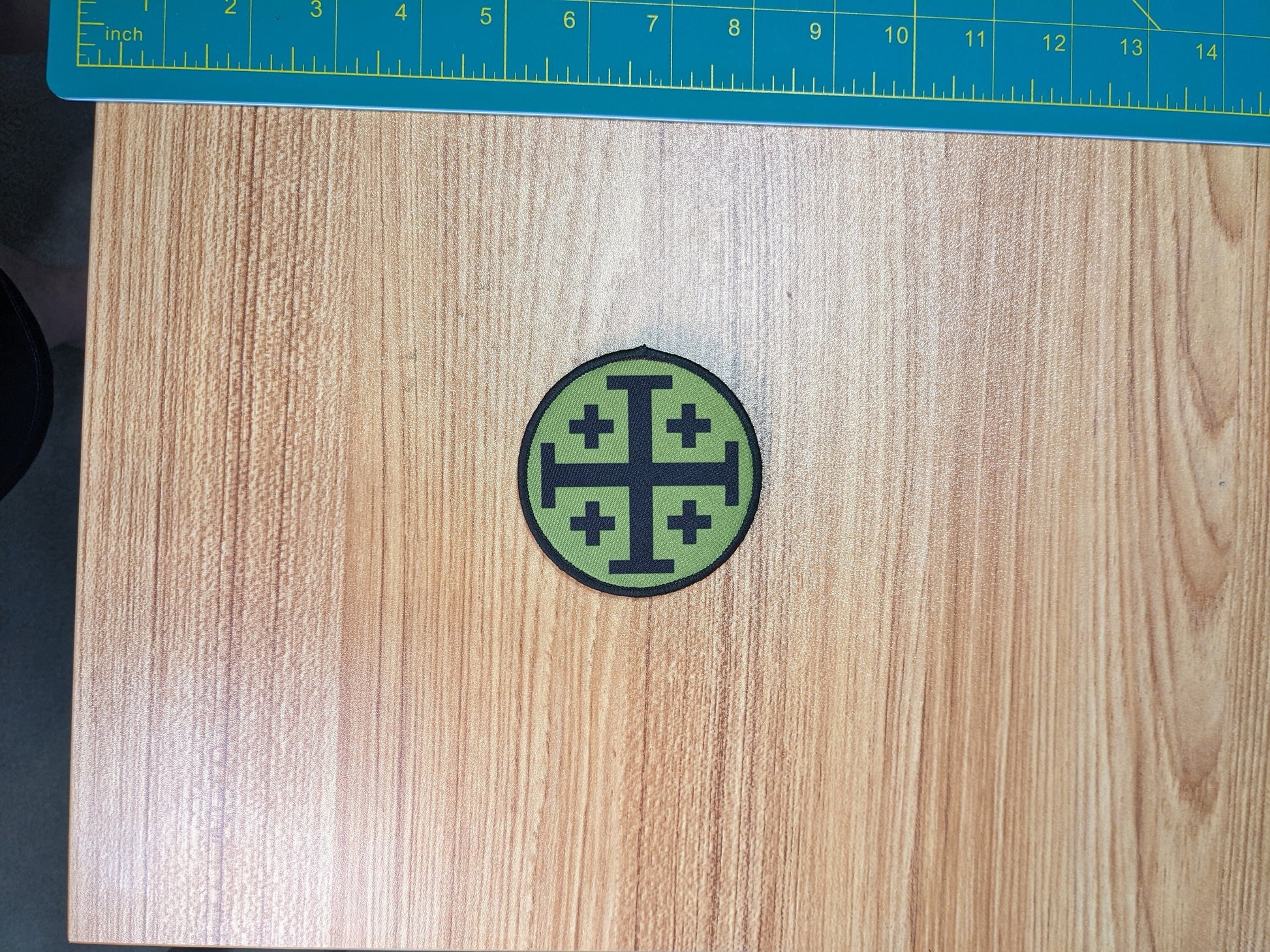 Jerusalem Cross olive background green 3" circle removable morale patch with hook and loop backing