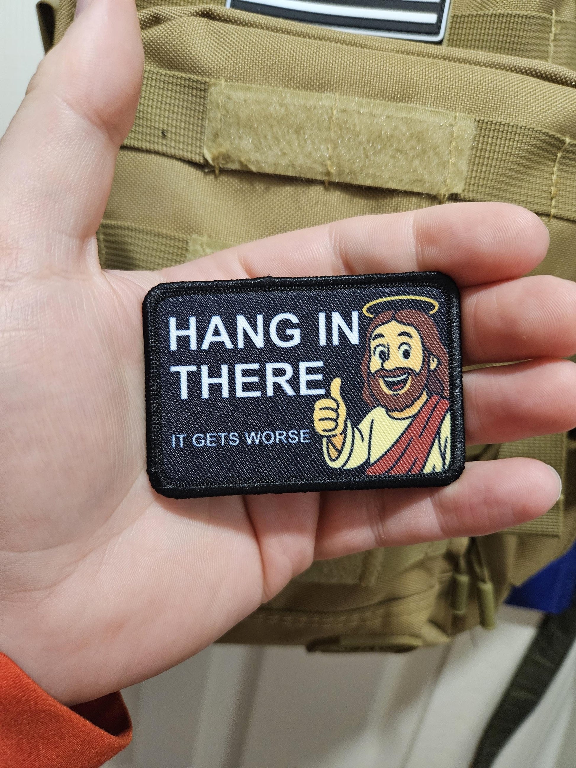 Jesus hang in there it gets worse meme 2"x3" removable morale patch with hook and loop backing black and white
