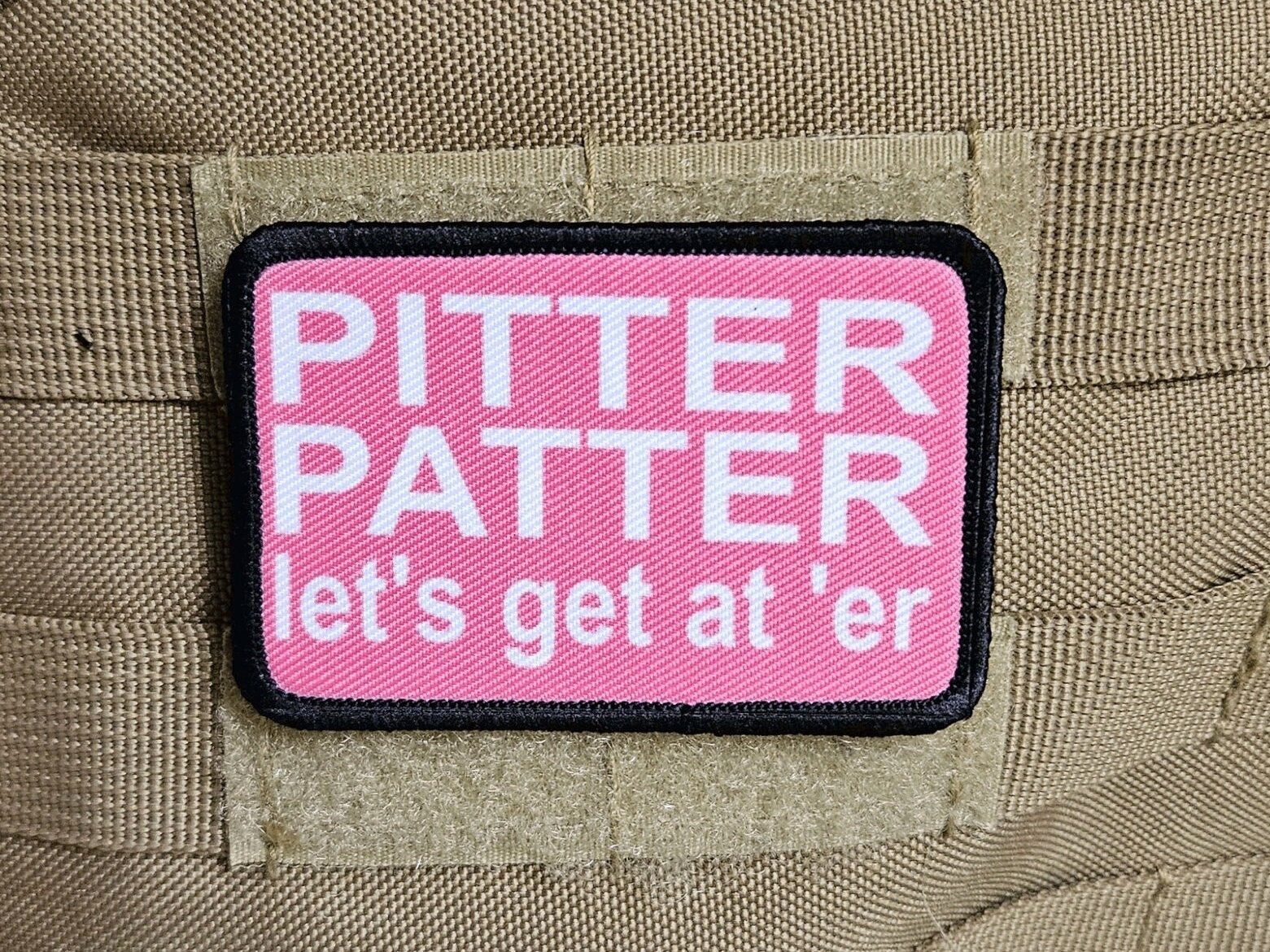 pink and white Pitter patter let's get at 'er meme 2"x3" removable morale patch with hook and loop backing