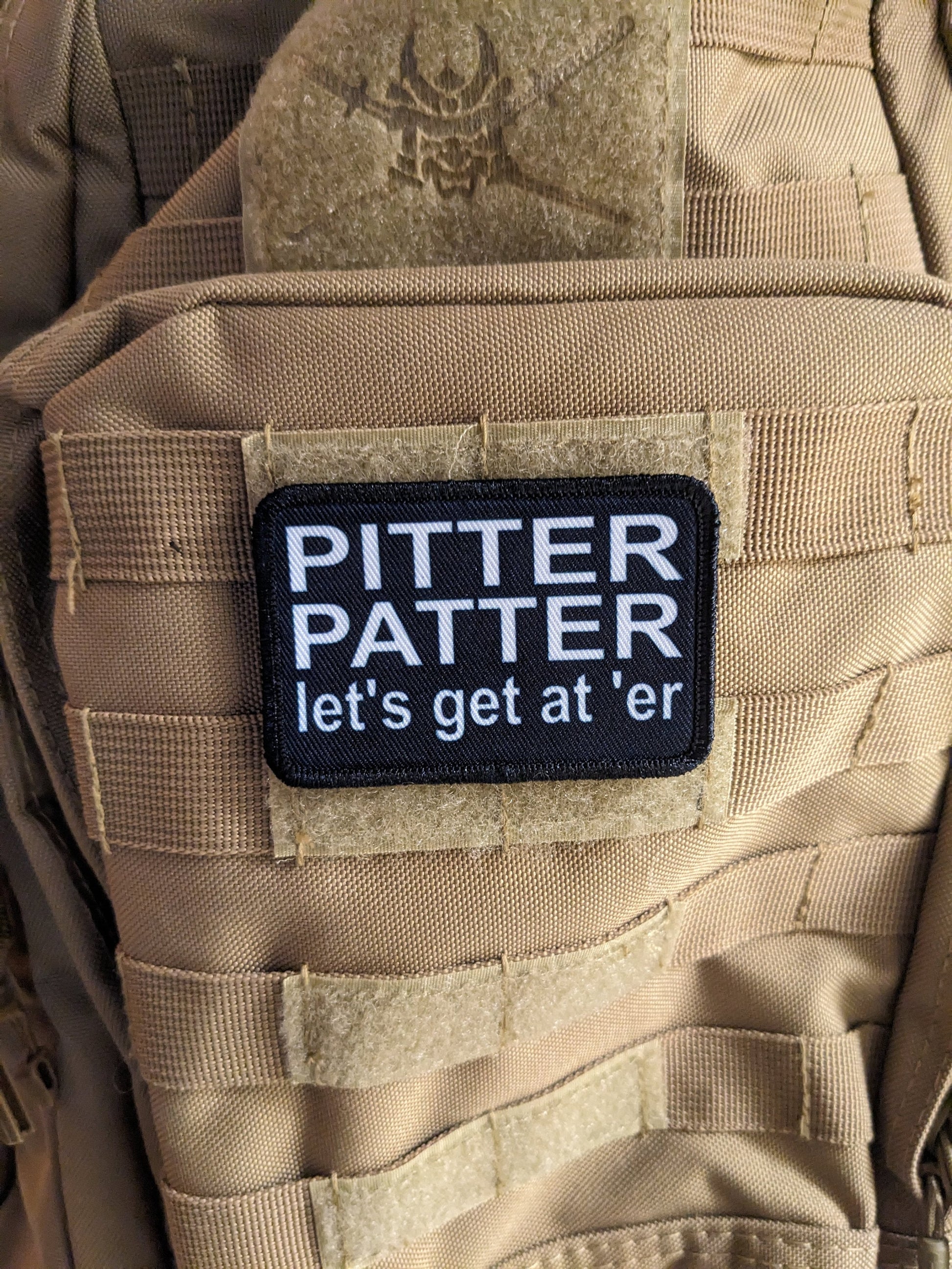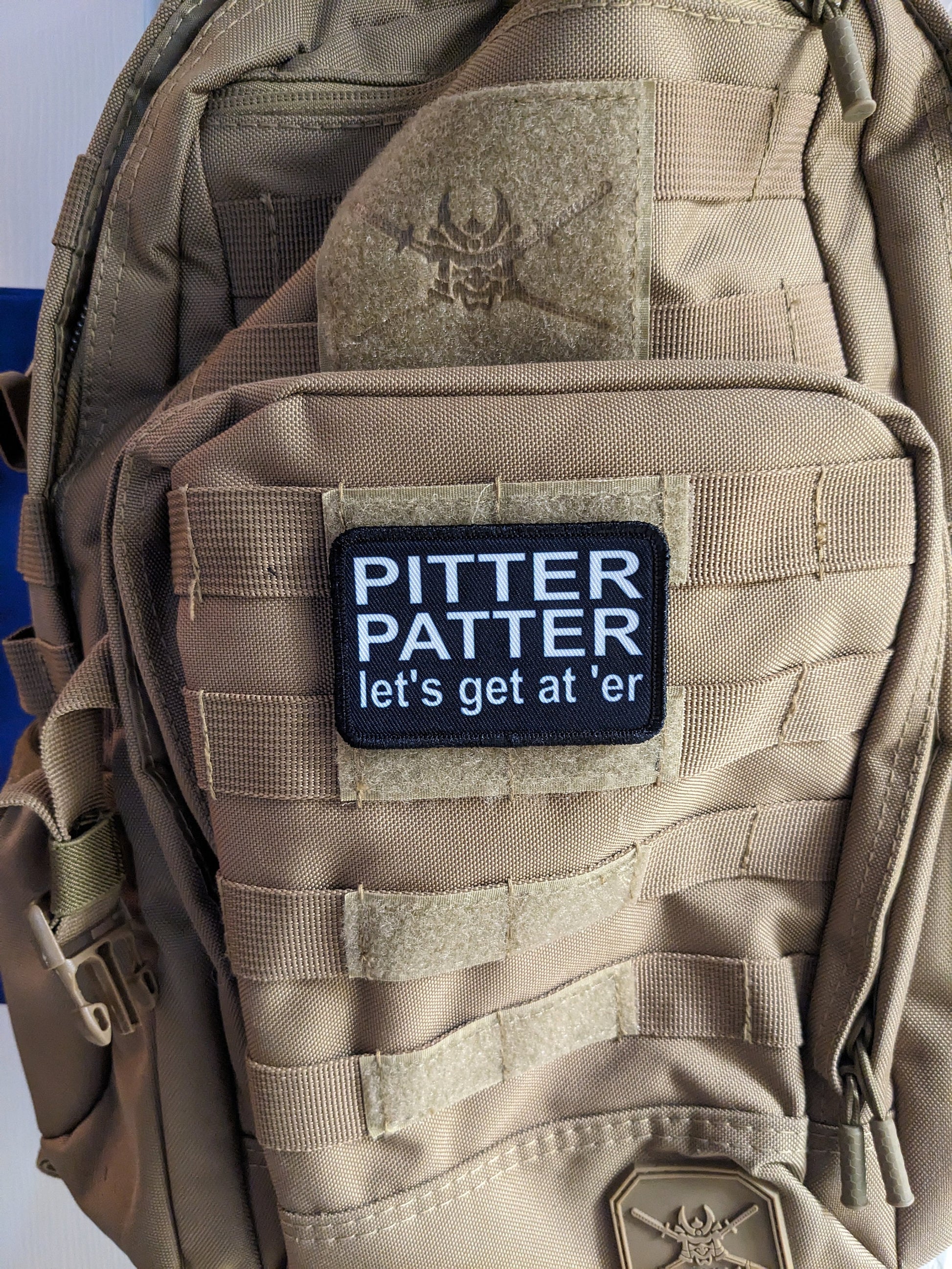 Pitter patter let's get at 'er meme 2"x3" removable morale patch with hook and loop backing black and white