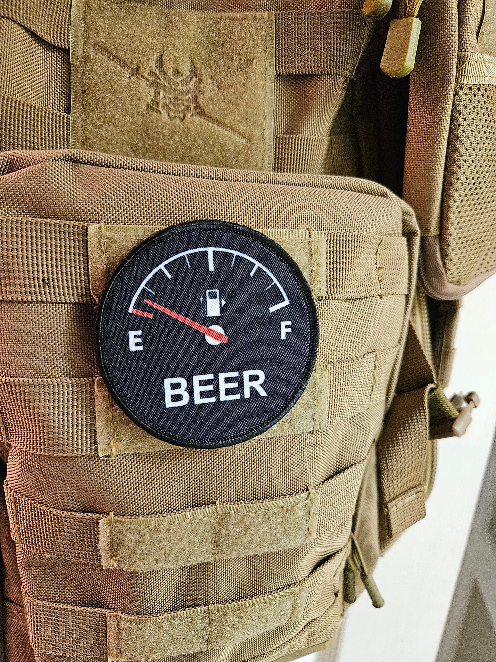 Running on empty beer meme 3" circle removable morale patch with hook and loop backing