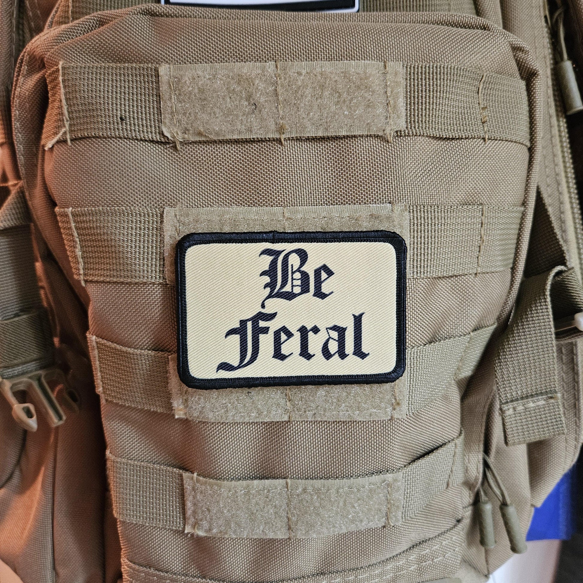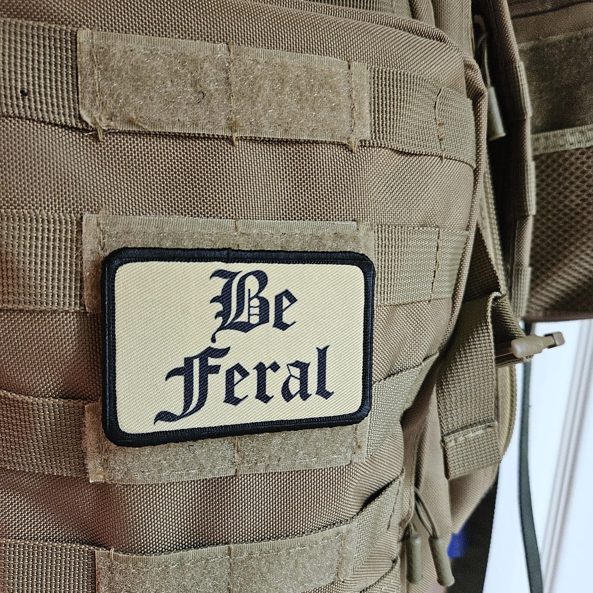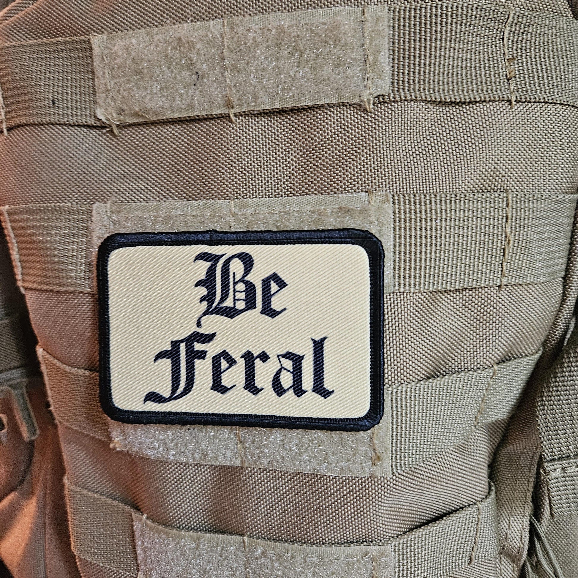 Tan "be feral" girls and boys meme 2"x3" morale patch with hook and loop backing