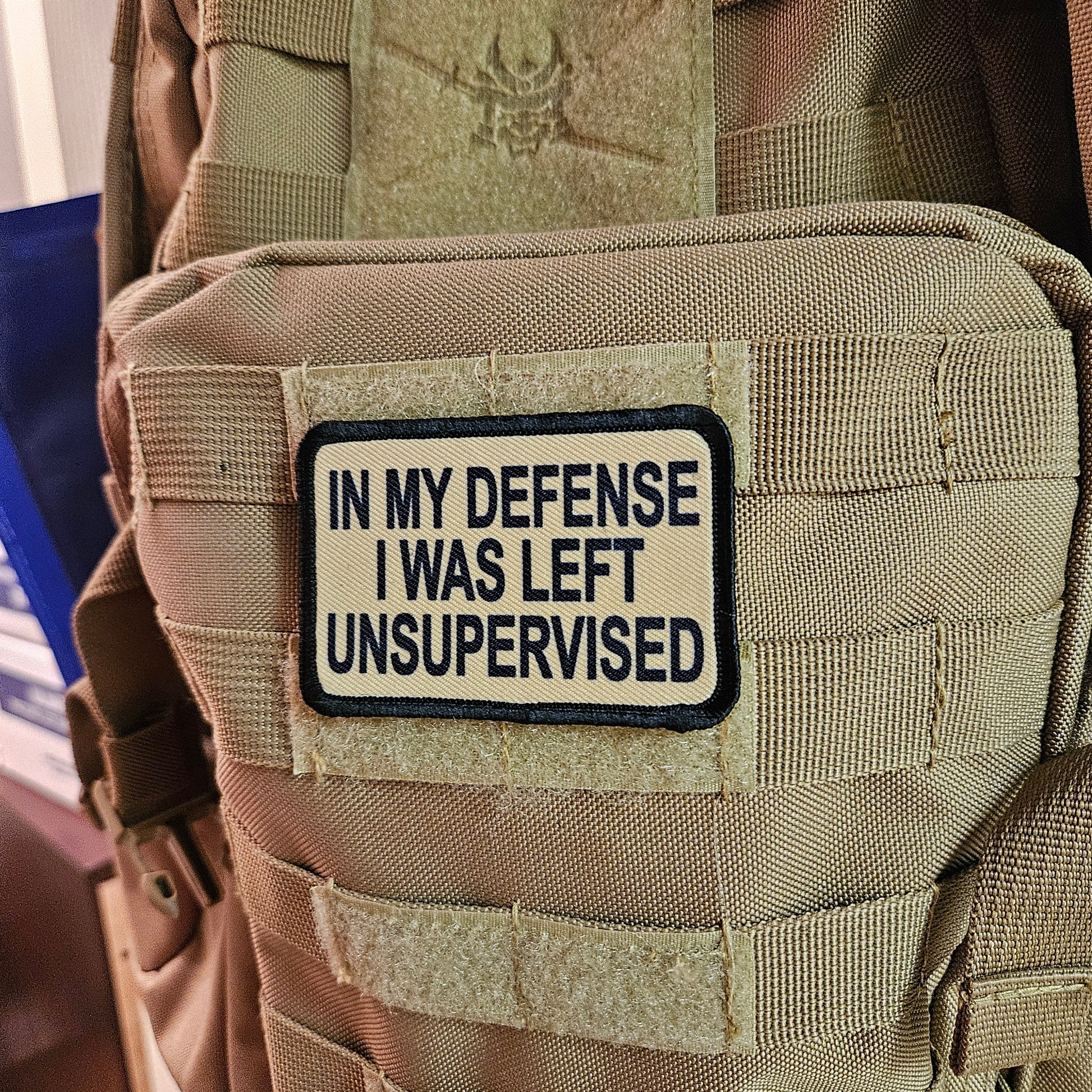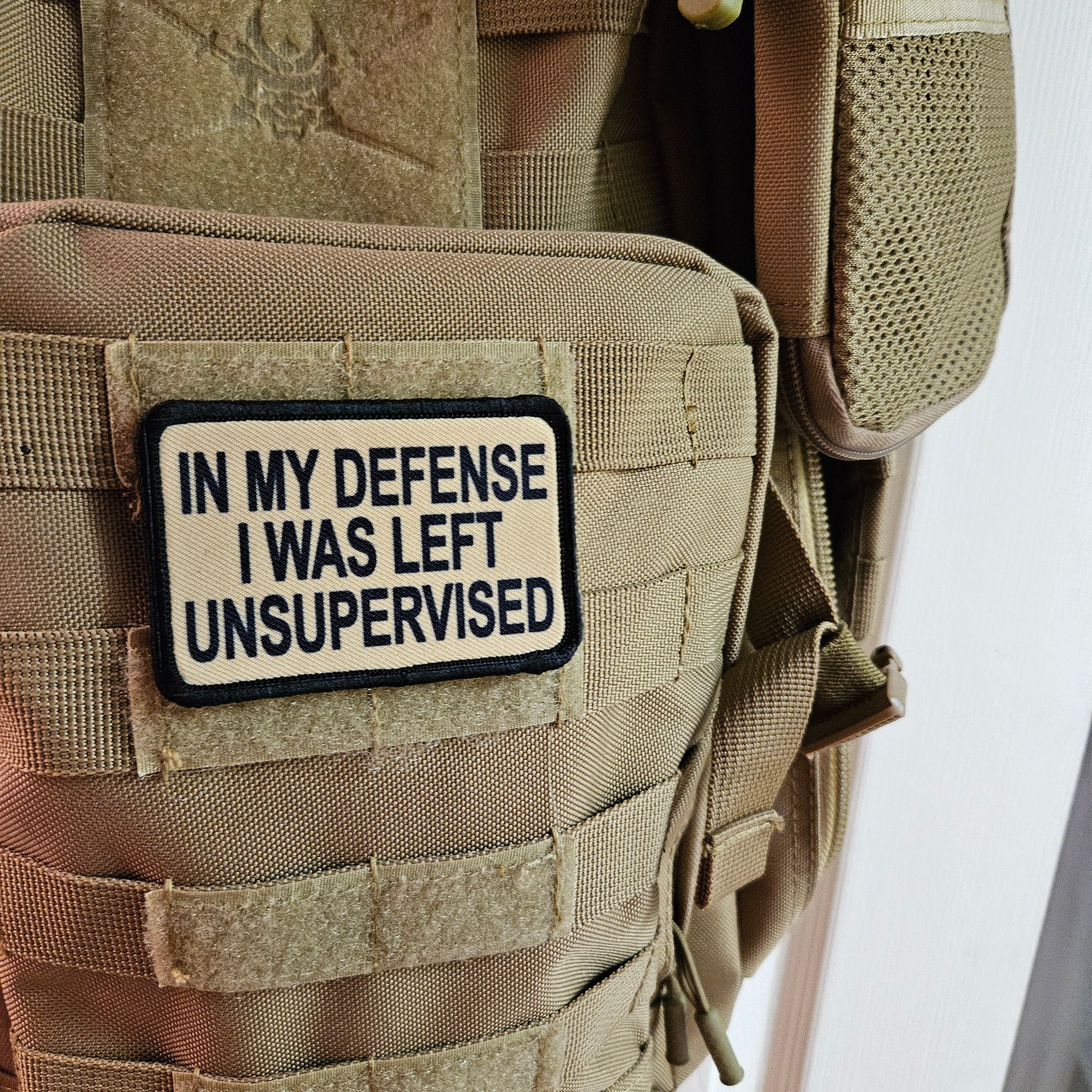Tan In My Defense I was left Unsupervised removable patch 2"x3" morale patch with hook and loop backing