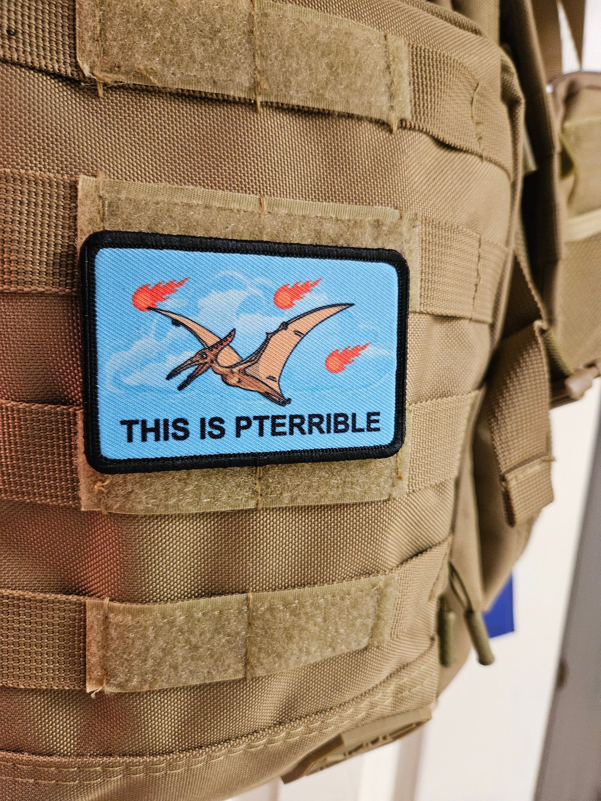 This is pterrible pterodactyl meme 2"x3" morale patch with hook and loop backing