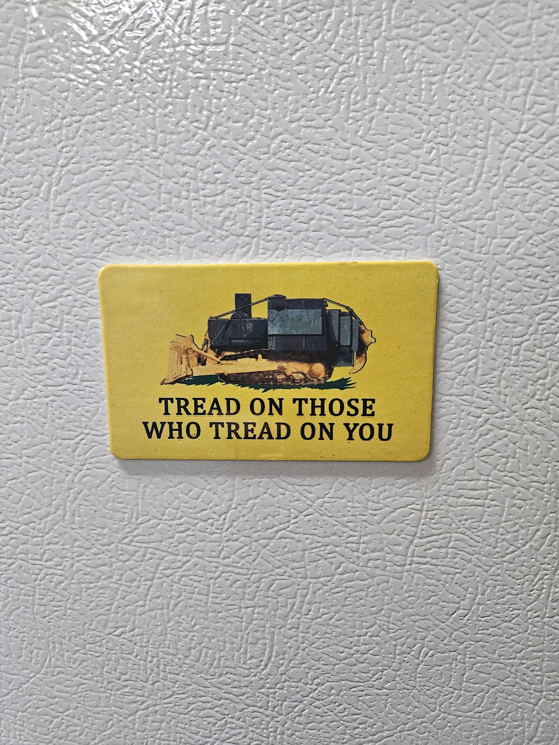 Tread on those who tread on you killdozer Gadsden flag parody fridge magnet x3. 2x3.5" dimensions