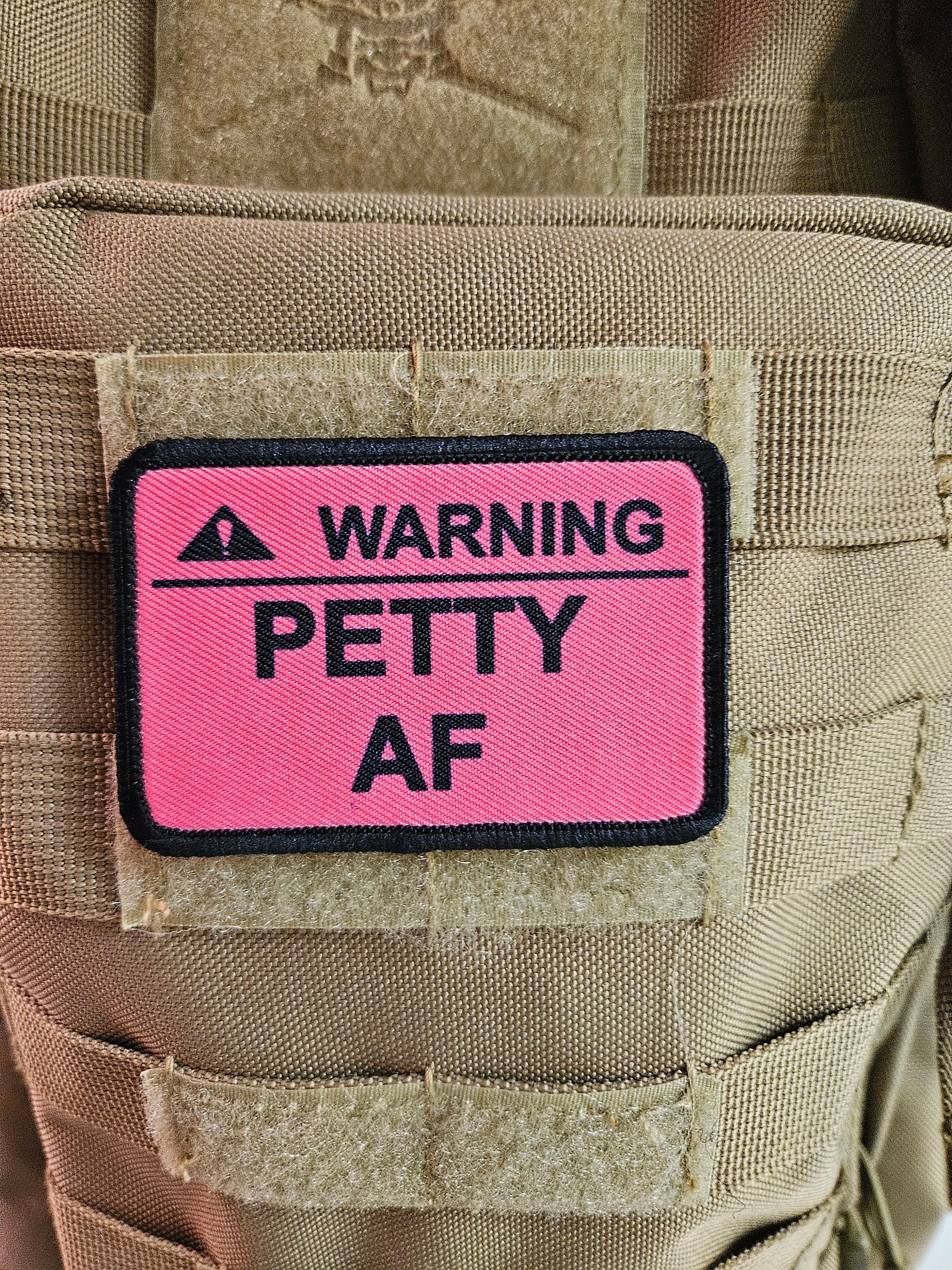 Warning petty AF meme pink 2"x3" removable morale patch with hook and loop backing