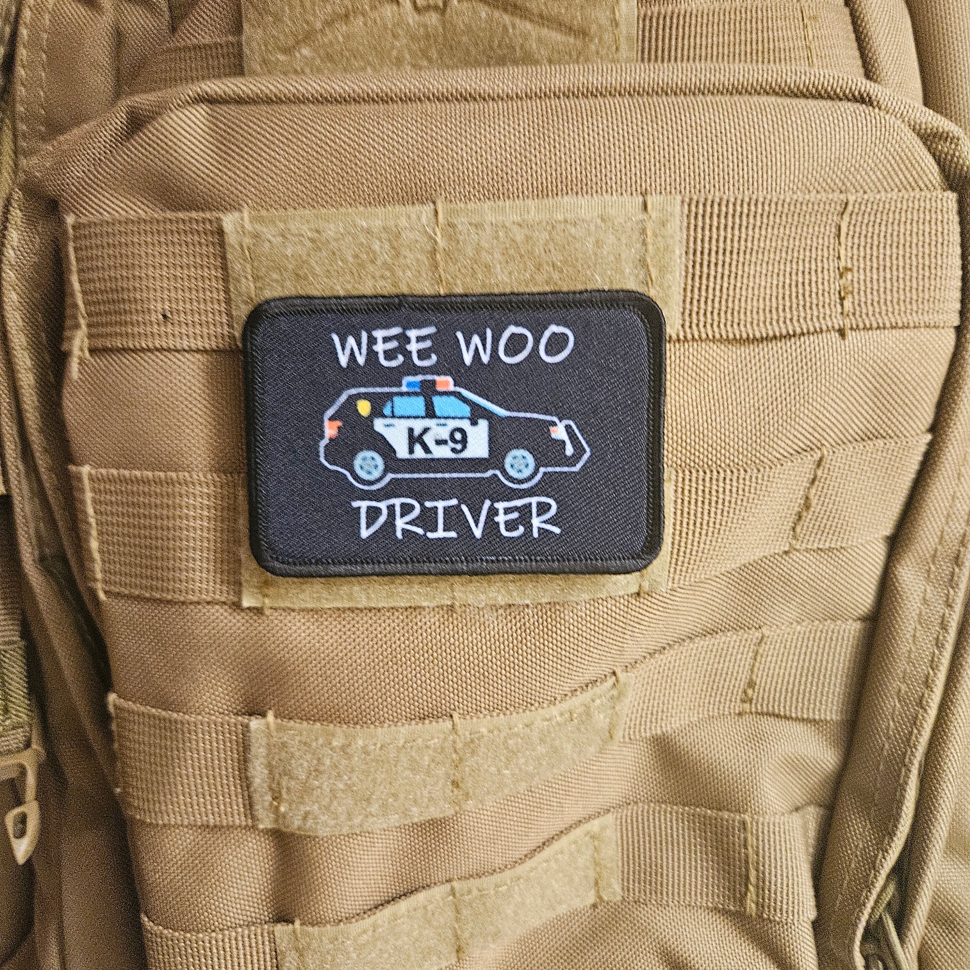 Wee woo driver k9 on door police SUV funny 2"x3" removable morale patch with hook and loop backing