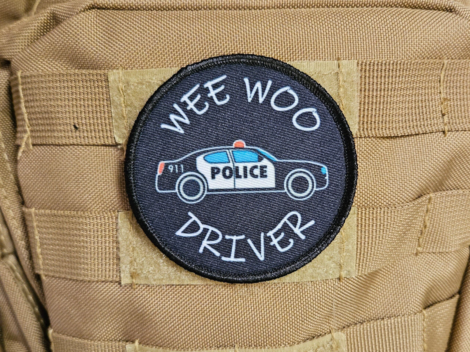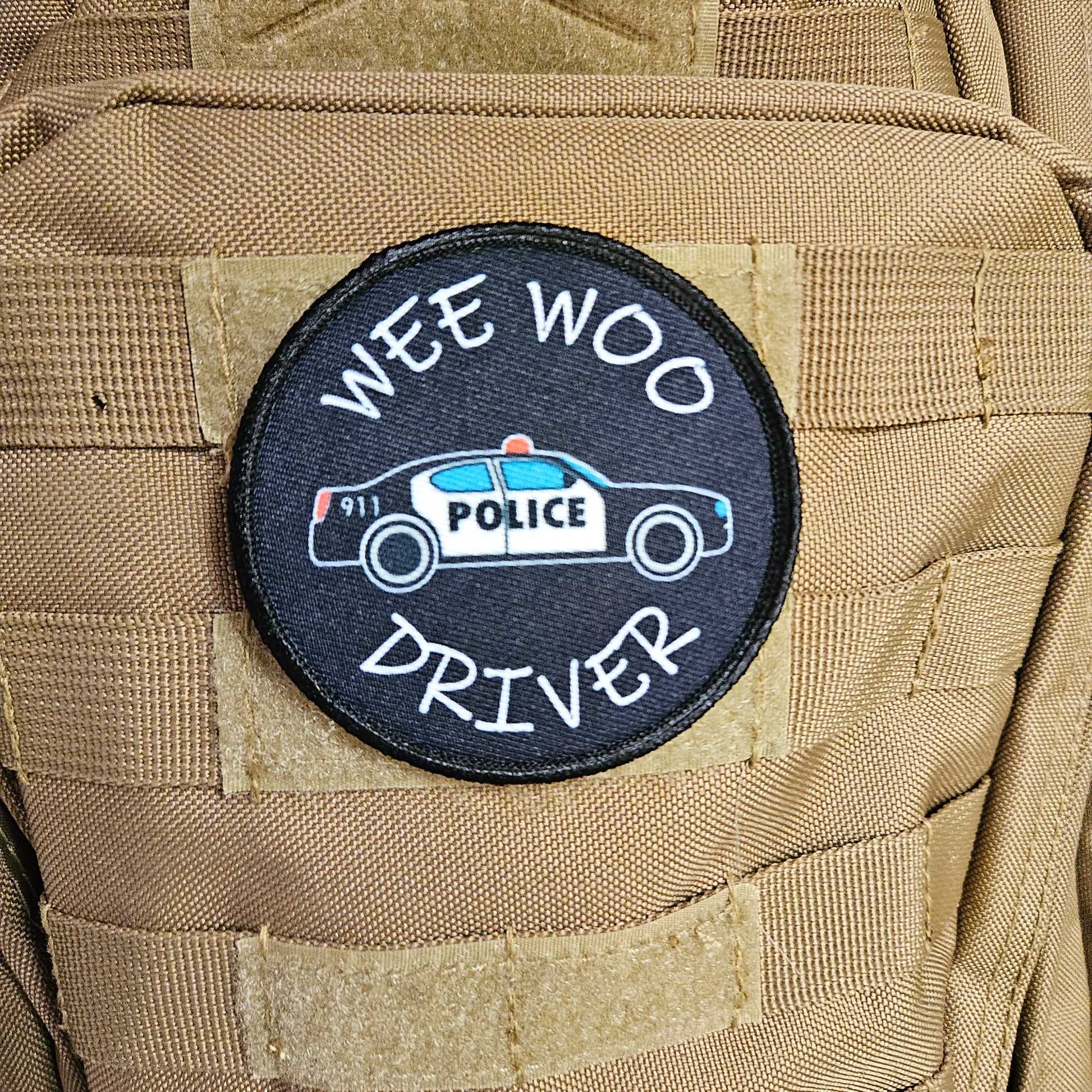 Wee woo driver police car driver funny 3" circle removable morale patch with hook and loop backing