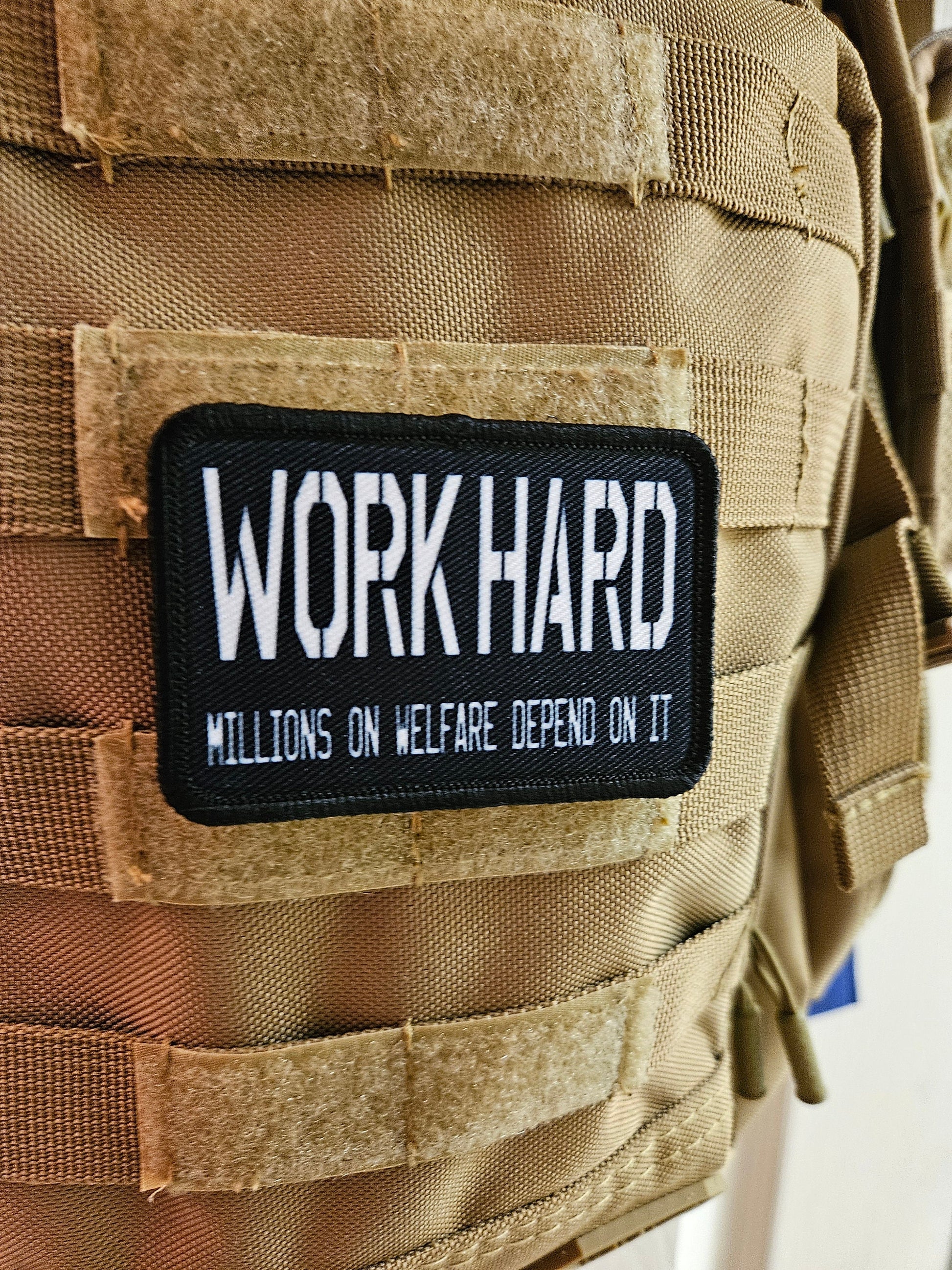 Work hard millions on welfare depend on it meme 2"x3" removable morale patch with hook and loop backing blue collar