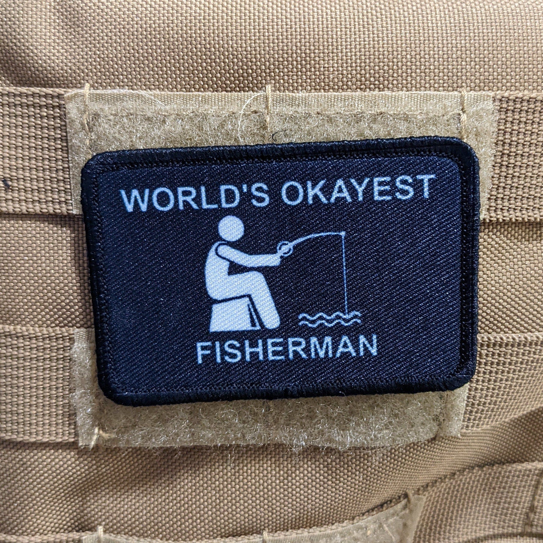 World's Okayest fisherman funny meme 2"x3" morale patch with hook and loop backing